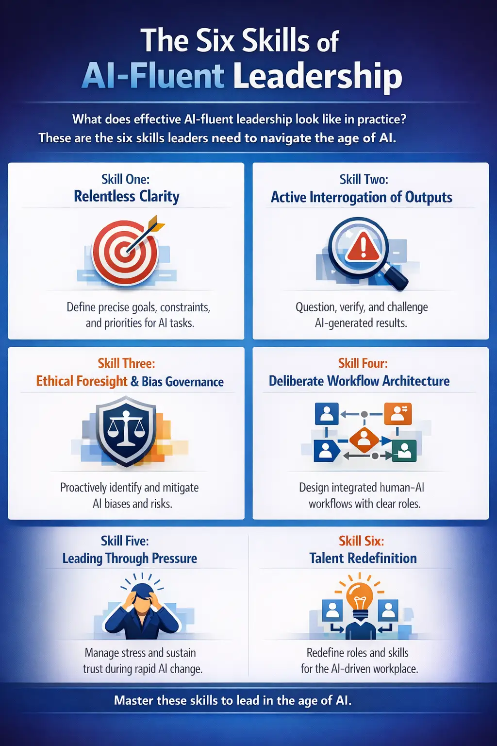 What does effective AI-fluent leadership actually look like in practice? Based on work with Fortune 500 companies and technology organizations navigating this transition, here is the framework I have developed and tested.